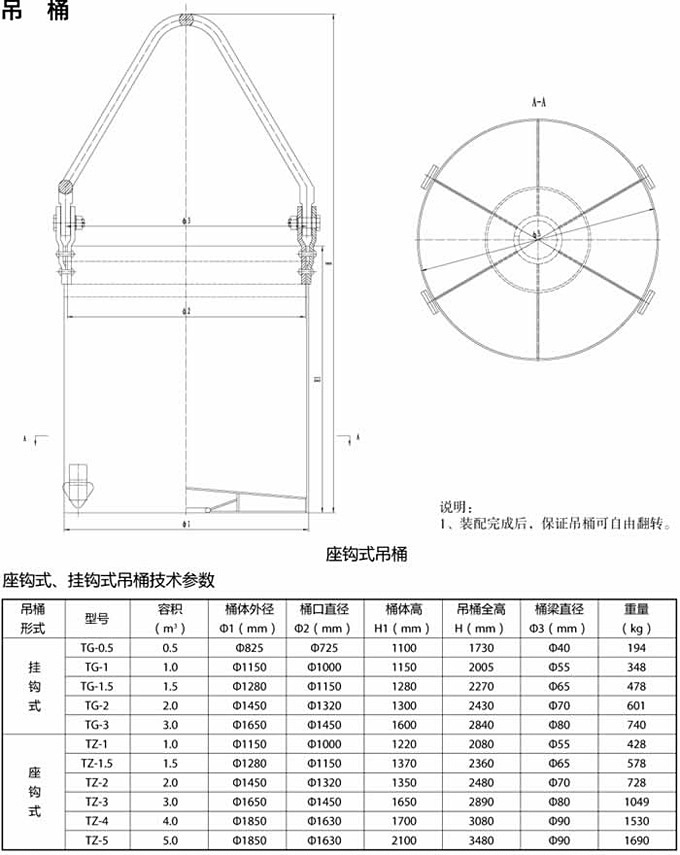 吊桶是立井井筒开凿期间提升矸石、升降人员和材料的主要容器。当井筒涌水量小于6m3/h时,还可作排水用,根据卸矸形式不同吊桶分为挂钩式吊座钩式吊桶。
