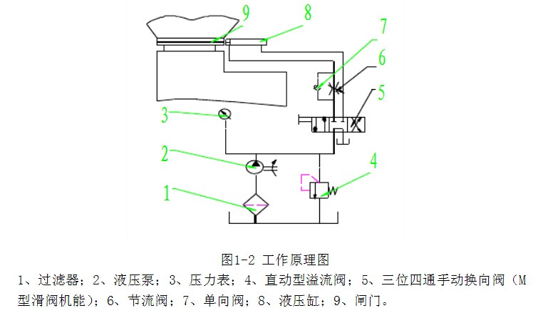 (1)针对防窜仓装置工作特点,对系统方案拟定如下:①防窜仓装置的组成。防窜仓装置由液压传动系统,机械执行机构、电气控制系统和传感器组成。② 闸门快速关闭所需要的动力。 (2)设计时主要考虑以下几点:①合理选择液压系统的参数,包括蓄能器的气体常数,充液压力,管路直径和长度,可以使防窜仓装置和闸门关闭时间控制在1 S以内。②蓄能器的气体常数和充液压力对系统的影响较大,如此值偏大,则液压缸活塞的运动速度增长过快,加速度大,对系统冲击也大;如此值偏小,则液压缸活塞的运动速度增大过缓,且速度衰减也较快。③管路直径对系统的性能影响最大,如管路直径偏小,则管内液体的流速就大,运动阻力急剧增加,造成液压缸活塞的运动加速度衰减过快,活塞运动速度上不去,影响闸门关闭时间。④在闸门关闭时间控制在1 S以内的技术指标下,管路长度可以满足液压动力装置实际工程应用中灵活布置的要求。⑤ 闸门质量、转动惯量的变化对系统的性能影响要很小。本液压动力装置能够适应不同的往复式给煤机其闸门质量及转动惯量变化的要求,具有一定的通用性。 1.2.2 工作原理
