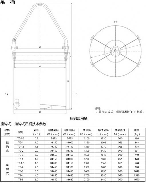 吊桶是立井井筒开凿期间提升矸石、升降人员和材料的主要容器。当井筒涌水量小于6m3/h时,还可作排水用,根据卸矸形式不同吊桶分为挂钩式吊座钩式吊桶。