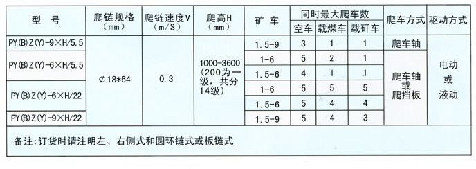 结构特征:爬车机本机分左侧式与右侧式两种,爬车方式分为爬矿车车架下档板和车轴。转动形式为链式、爬行高度从1米到3.6米分14种。